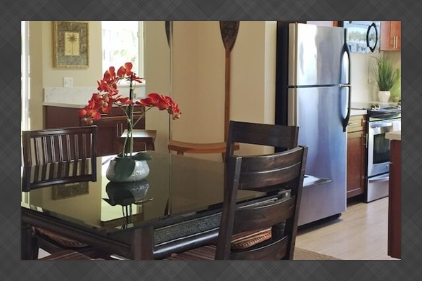 The Living Room: TV, Cable & Complimentary WiFi ~ 2 Comfortable Sofas and Island Themed Decor Await You. Open Floor Plan allows guests to Roam from Dining Room, Kitchen, Living Room and Balcony.