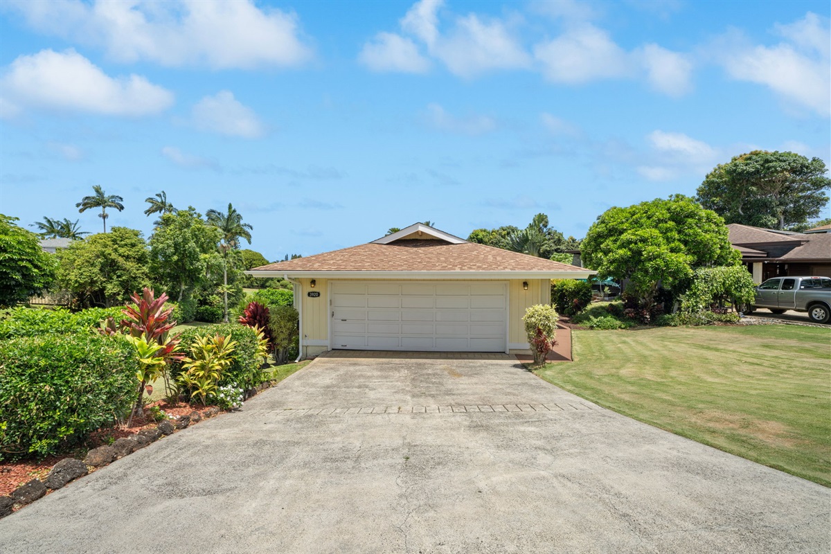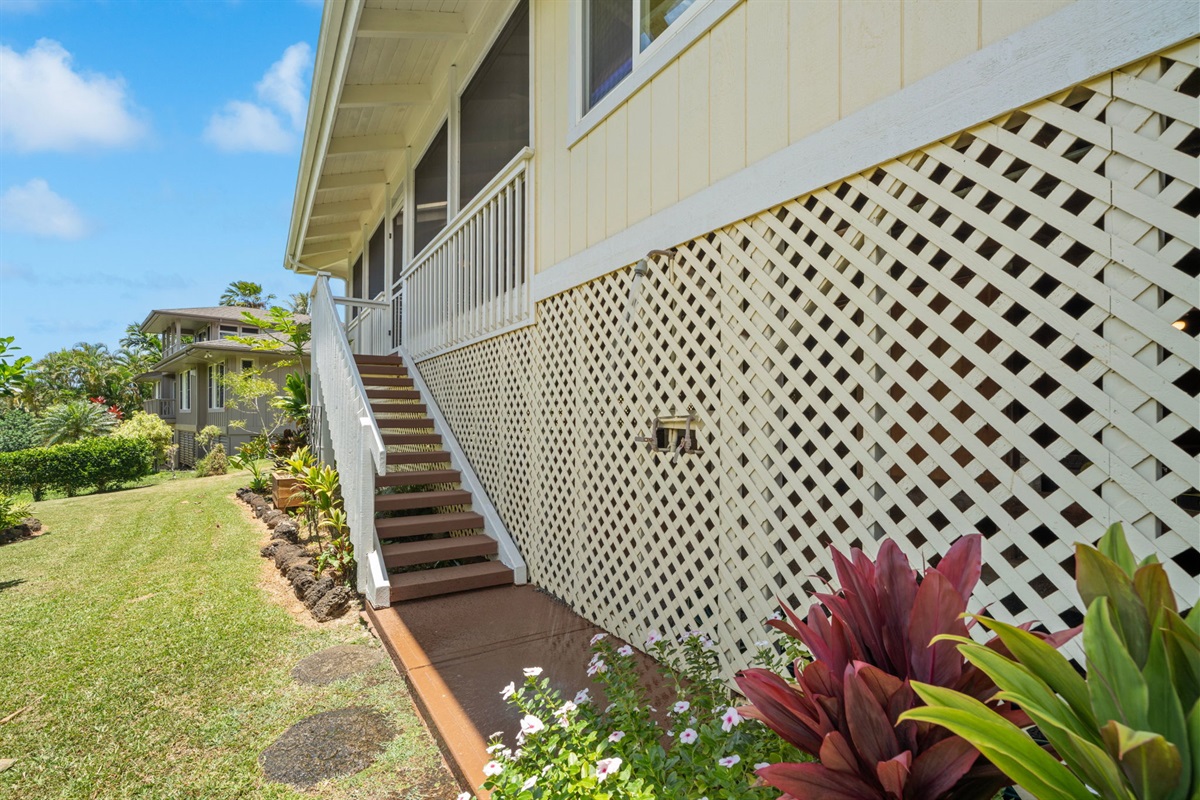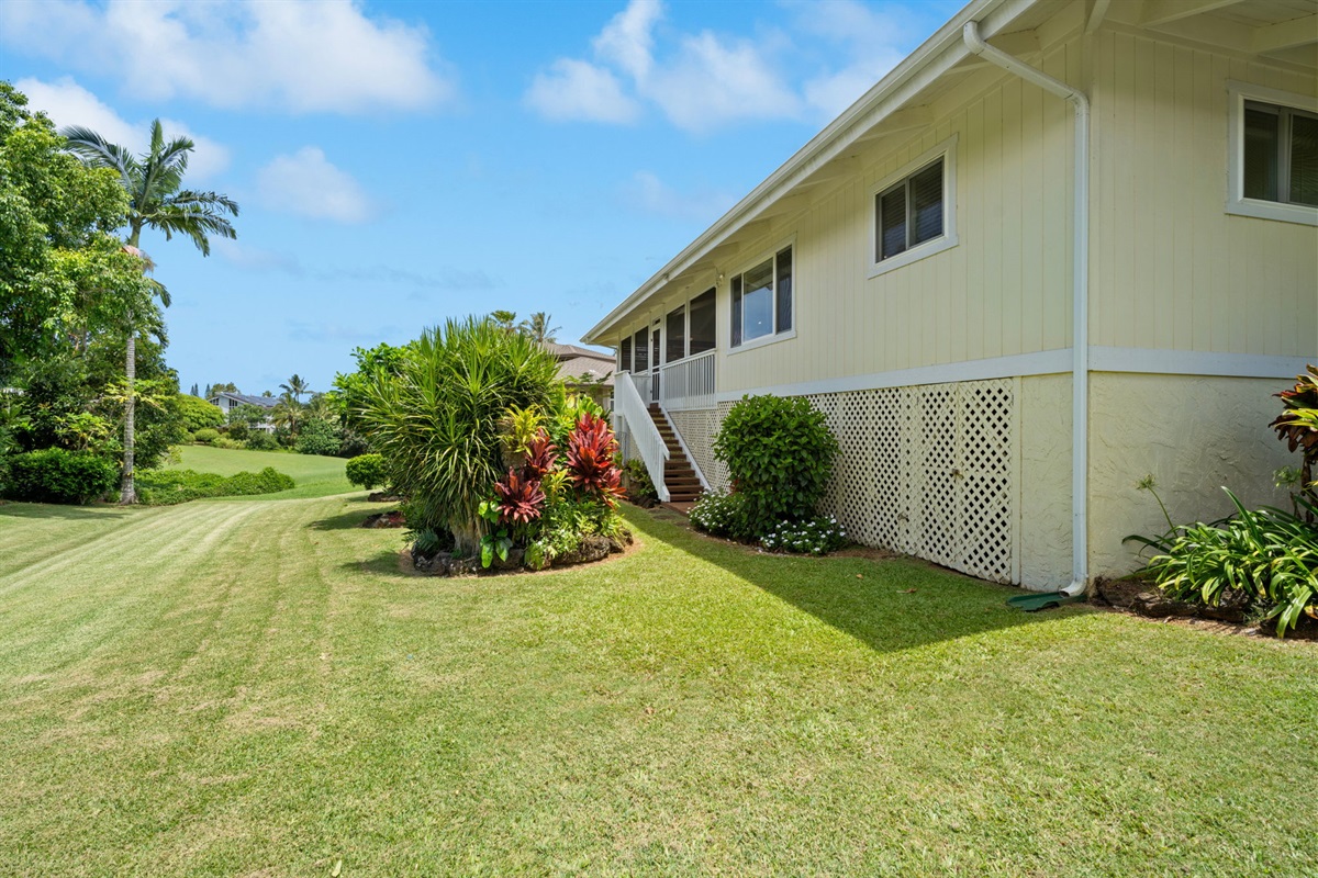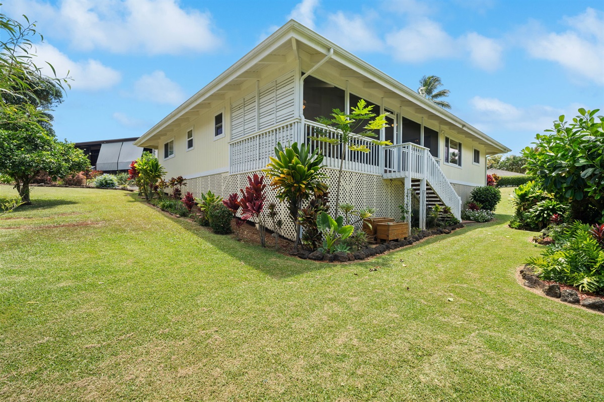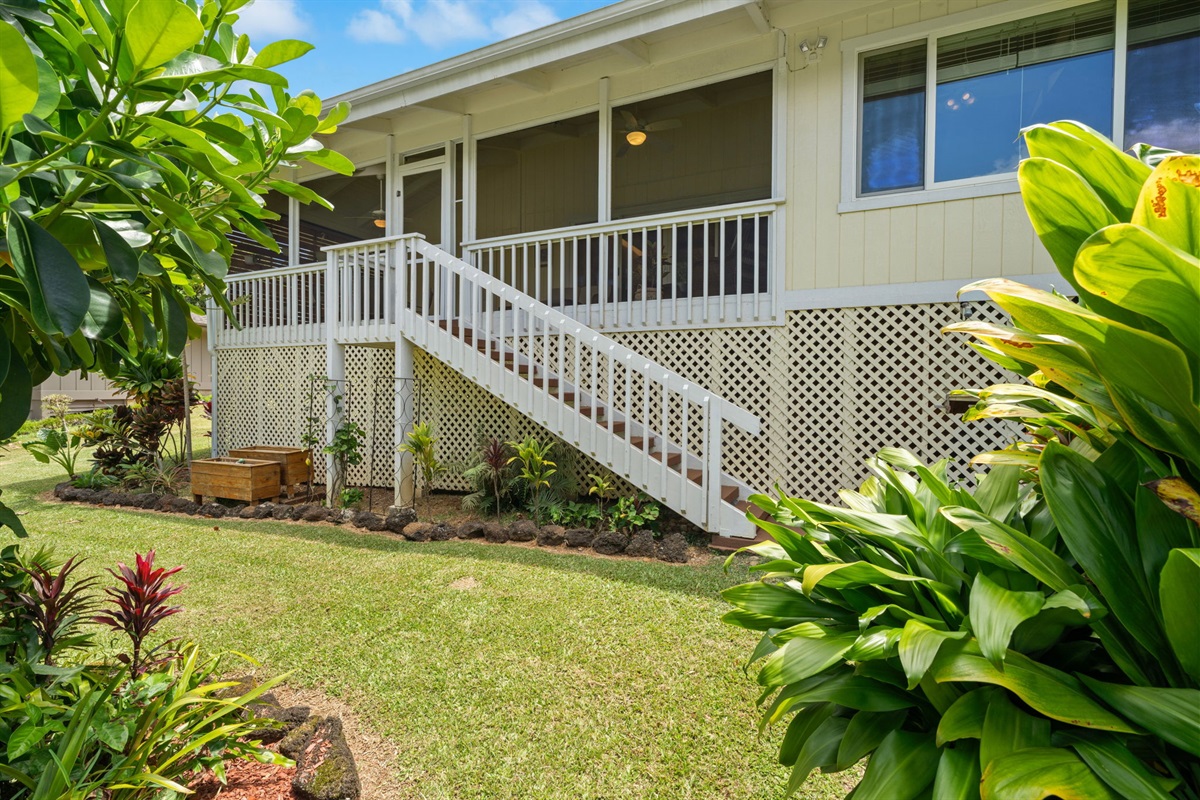 Life here flows effortlessly outdoors. The expansive screened-in lanai becomes your personal island lounge—perfect for open-air dining, afternoon naps, or simply listening to the gentle breeze rustle through the palms. Beyond, the lush grounds feel like a private botanical garden, filled with vibrant tropical flowers and mature fruit trees that capture the essence of Kauai.