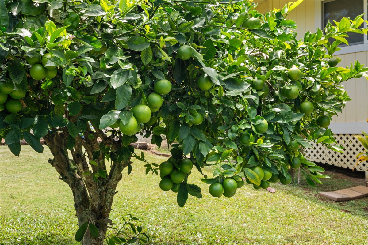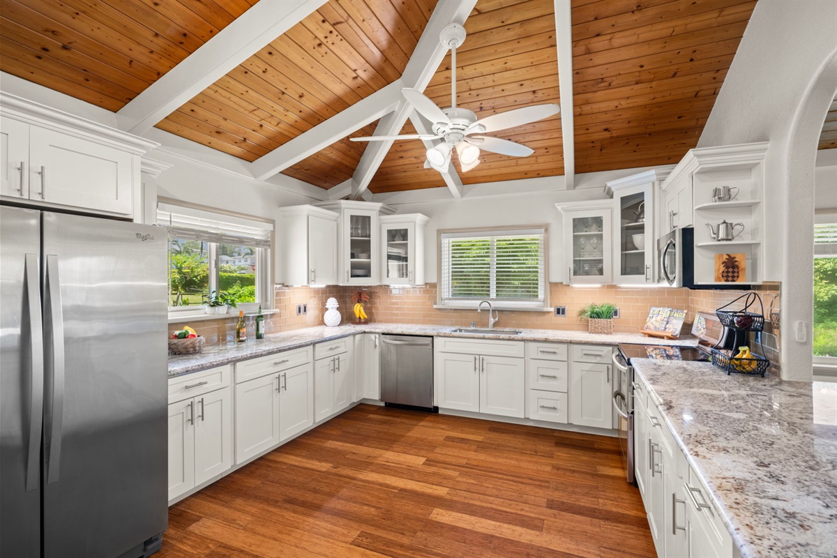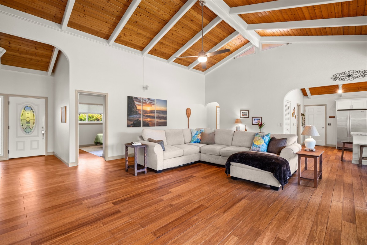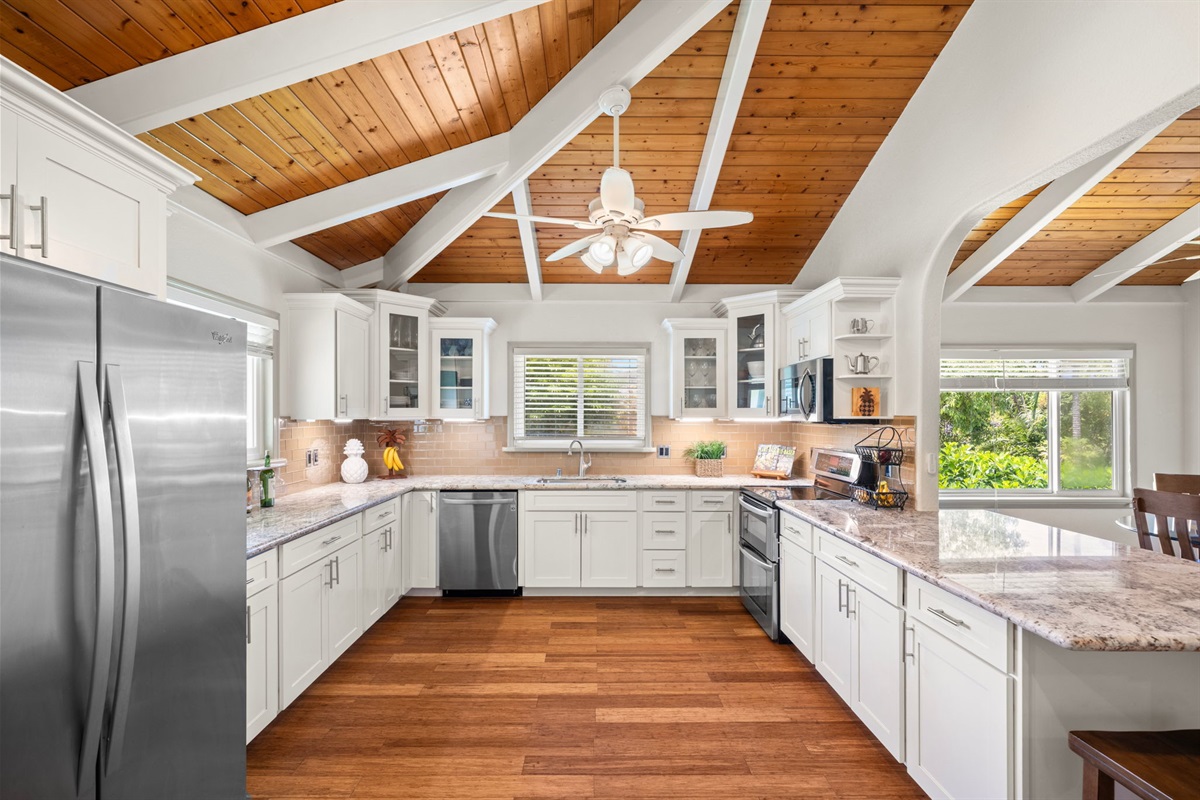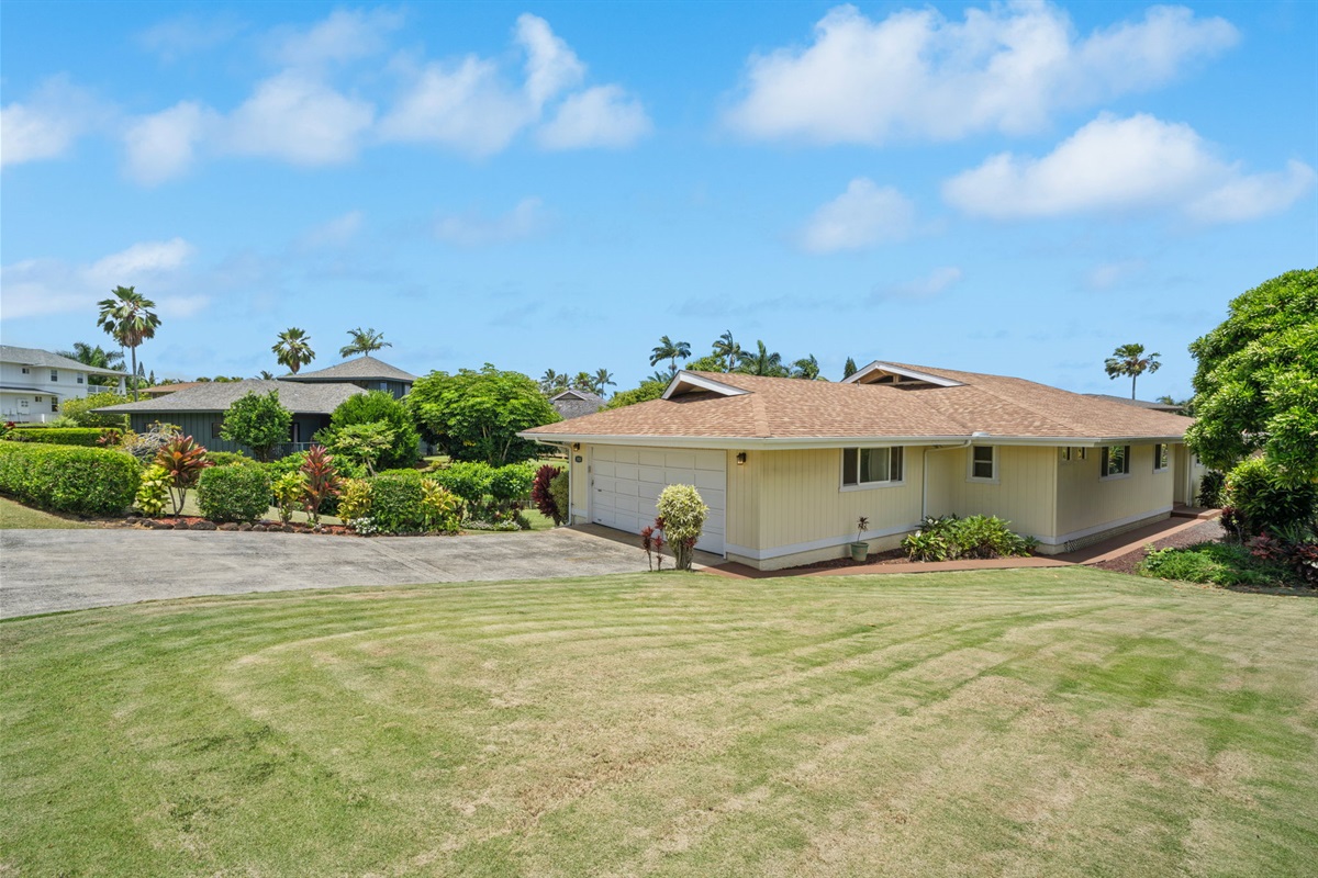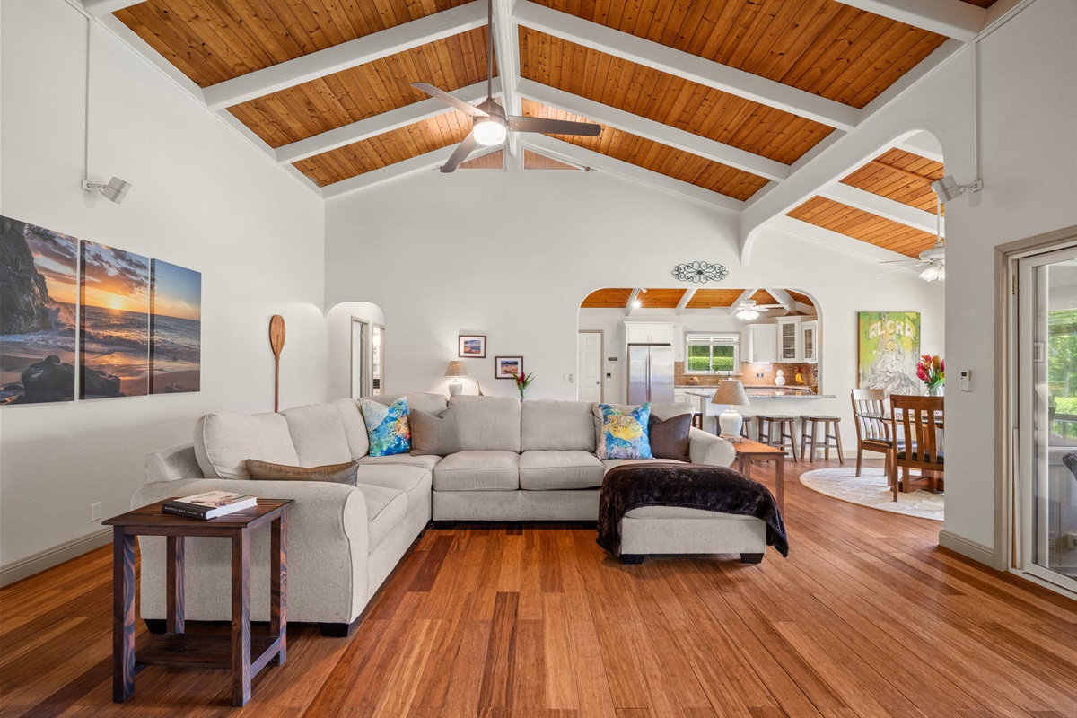 Life here flows effortlessly outdoors. The expansive screened-in lanai becomes your personal island lounge—perfect for open-air dining, afternoon naps, or simply listening to the gentle breeze rustle through the palms. Beyond, the lush grounds feel like a private botanical garden, filled with vibrant tropical flowers and mature fruit trees that capture the essence of Kauai.