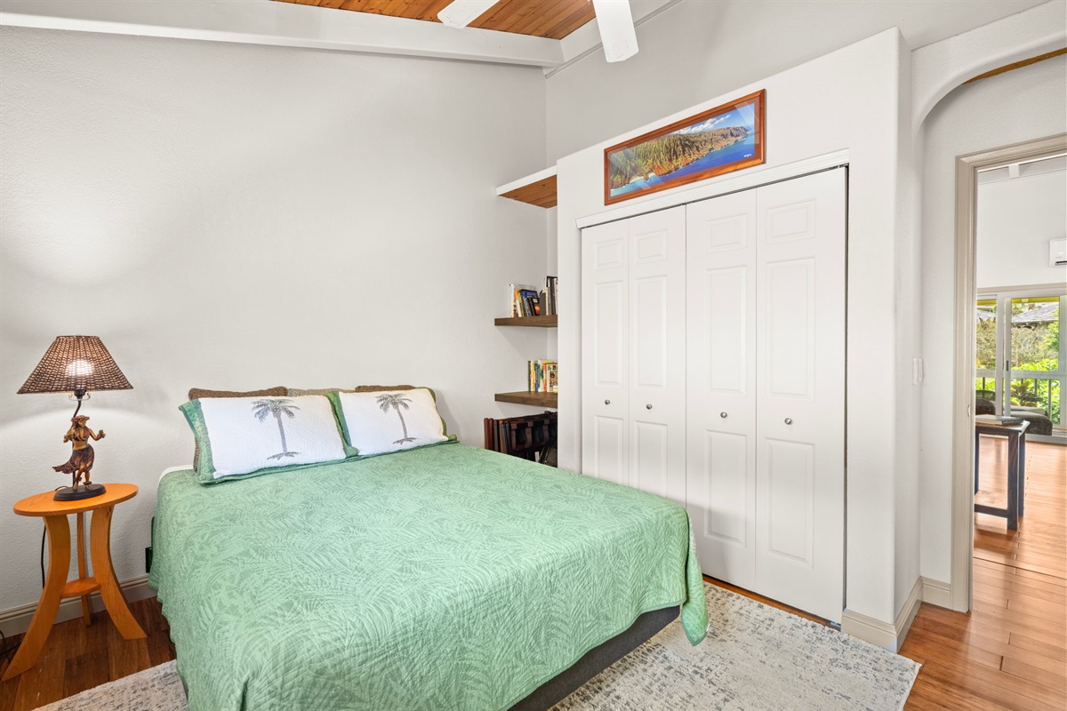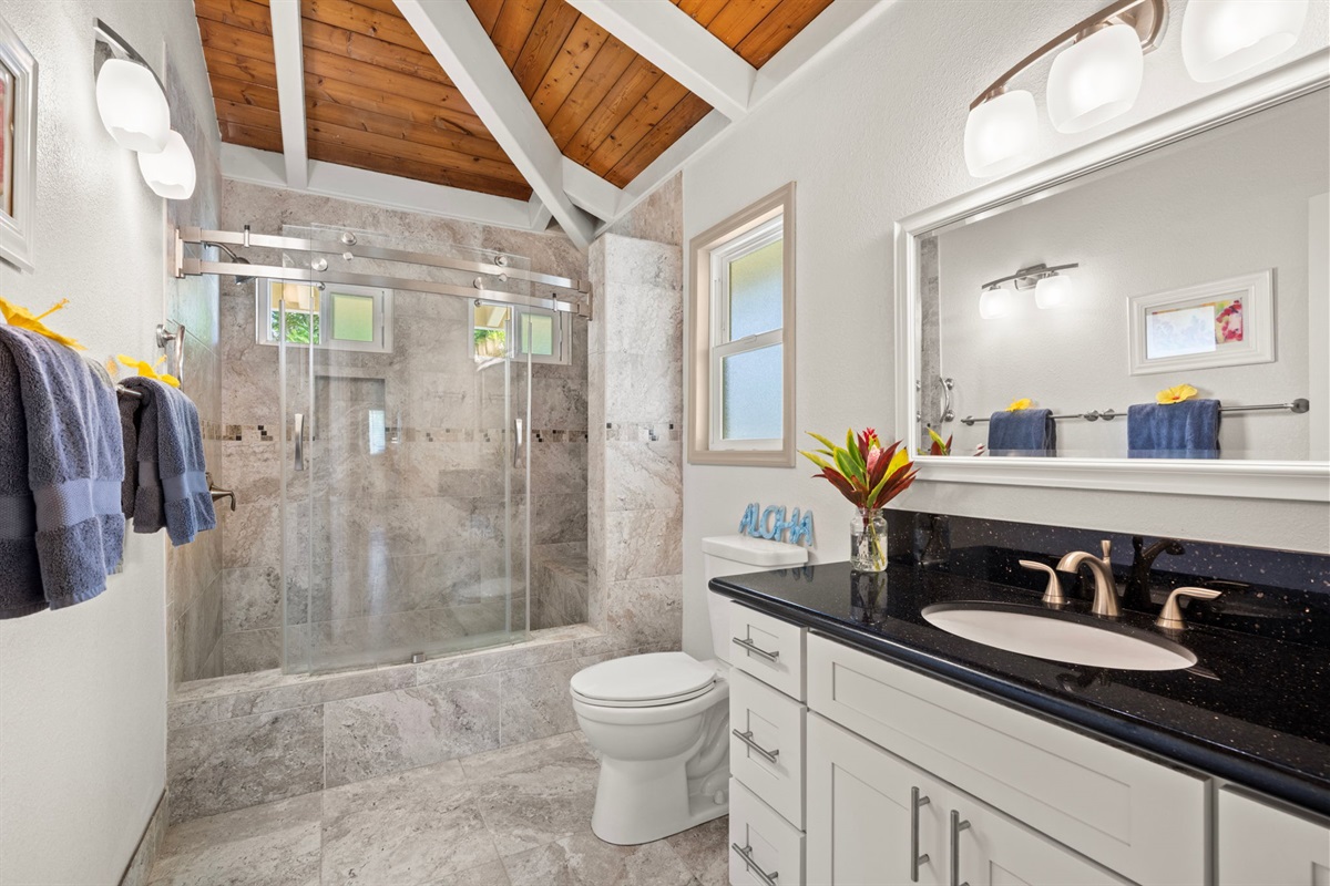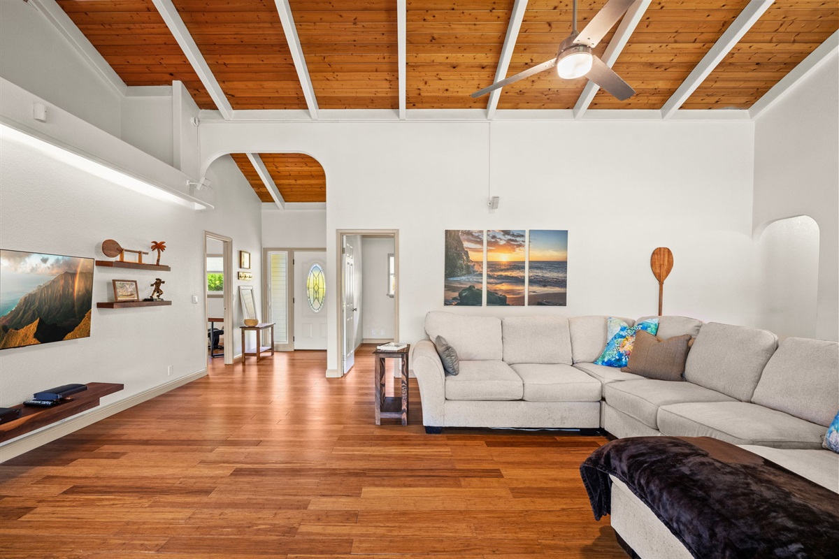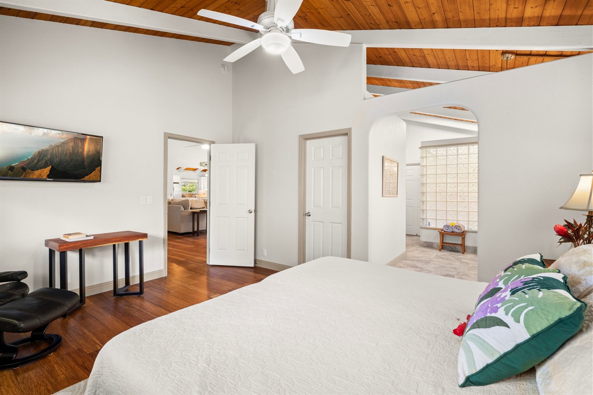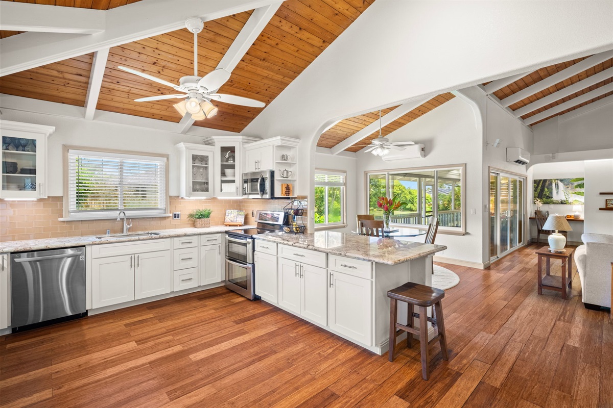 Life here flows effortlessly outdoors. The expansive screened-in lanai becomes your personal island lounge—perfect for open-air dining, afternoon naps, or simply listening to the gentle breeze rustle through the palms. Beyond, the lush grounds feel like a private botanical garden, filled with vibrant tropical flowers and mature fruit trees that capture the essence of Kauai.