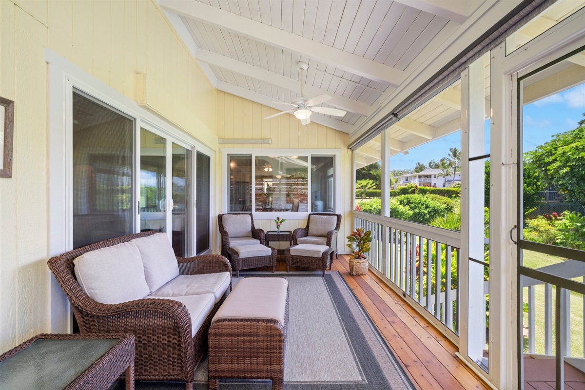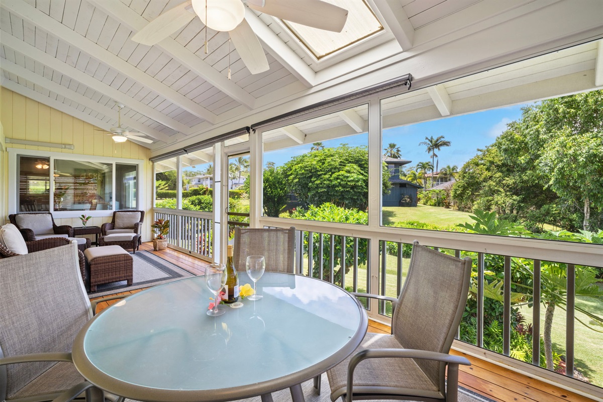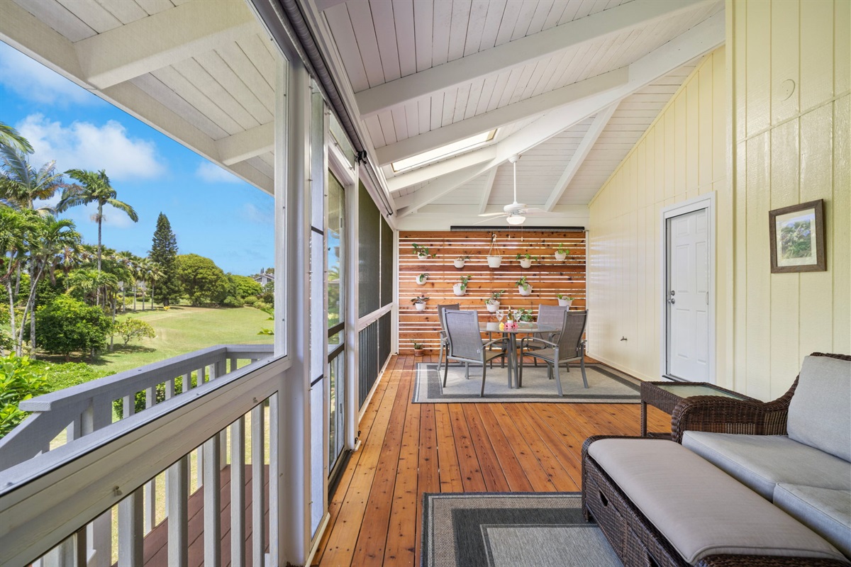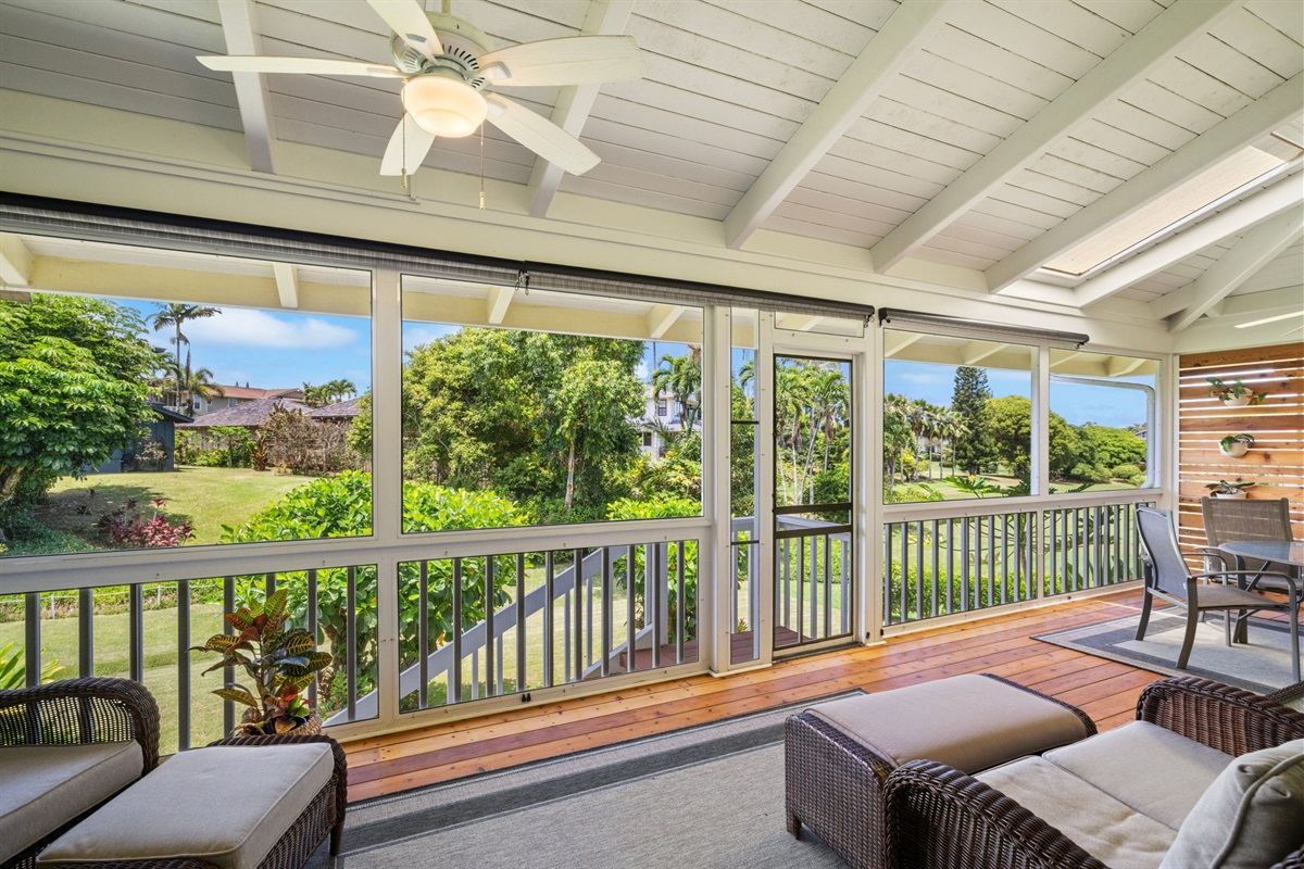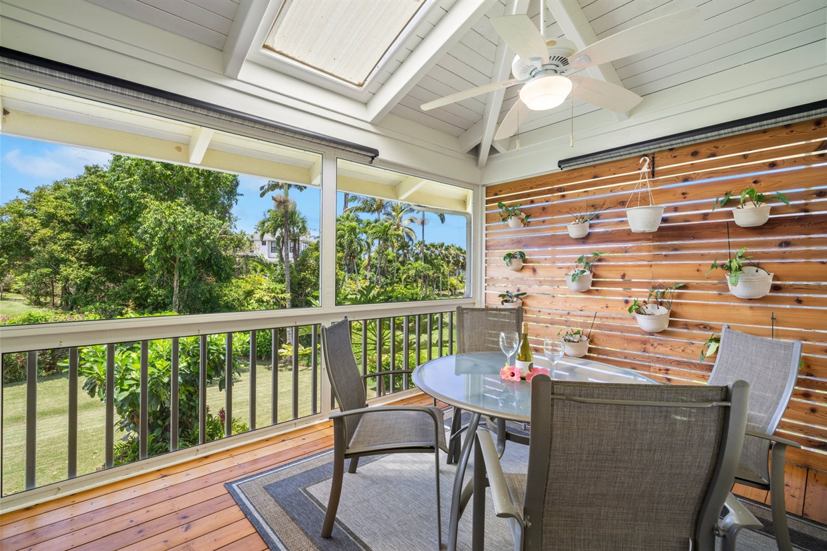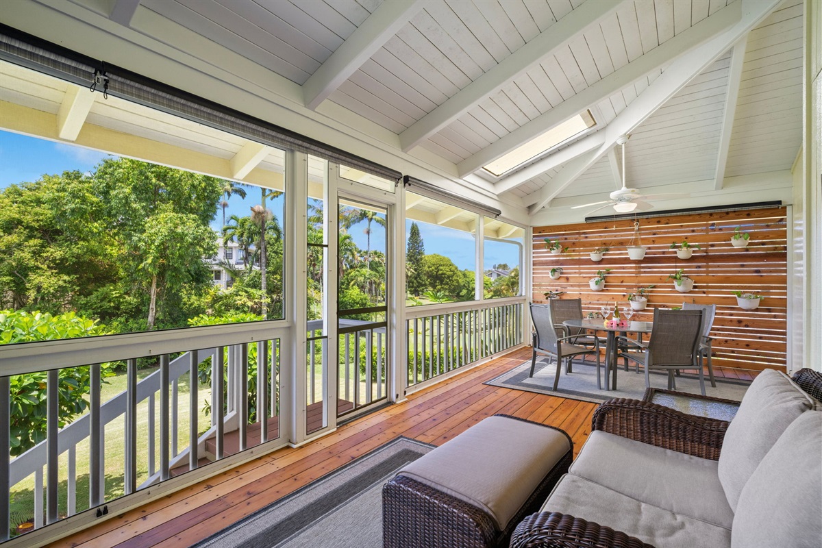 * A spacious, fully furnished lanai with dining space and privacy shades—perfect for relaxing in total tranquility